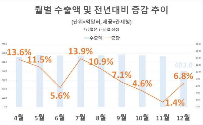 12월 1~20일 수출 403억불, 전년 6.8% 증가
