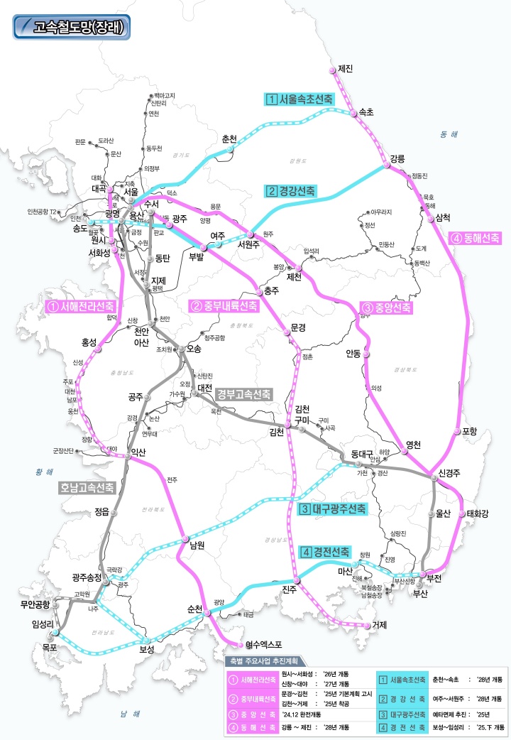 - 고속철도망: 경부·호남 고속선축 외에도 4 × 4 고속철도망 구축을 가속화하여 전국 주요 거점을 빠르게 연결할 예정이다.
