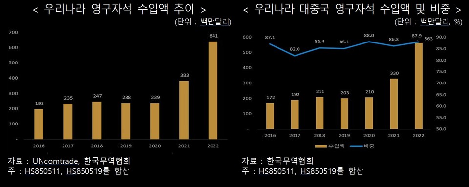 한국의 희토류 수입 현황을 살펴보면, 2016년부터 2022년까지의 수입 추세가 눈에 띄게 증가하고 있어요. 2016년에는 1억 9800만 달러였던 수입액이 2022년에는 6억 4100만 달러로 증가했어요. 특히, 중국으로부터의 수입 비율도 87.1%에서 90%로 증가했답니다. 이는 한국이 여전히 중국에 의존하고 있다는 것을 보여주고 있어요.