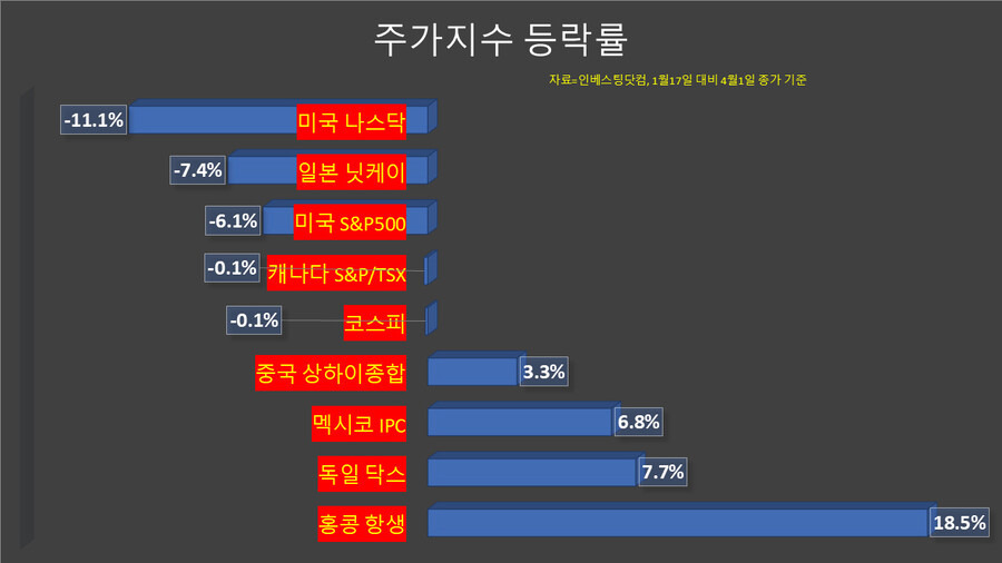 최근 발표된 자료에 따르면, 미국의 나스닥 지수는 -11.1%, S&P 500은 -6.1%의 하락률을 기록했어요. 반면, 중국의 상하이 종합지수는 3.3% 상승했죠. 이는 미국의 관세 정책이 다른 국가의 주식 시장에 긍정적인 영향을 미치고 있다는 것을 보여줘요.