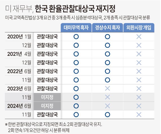 한국은 2016년 4월 이후 7년여 만에 환율 관찰 대상국에서 빠졌지만, 2023년 11월 다시 재지정되었어요.