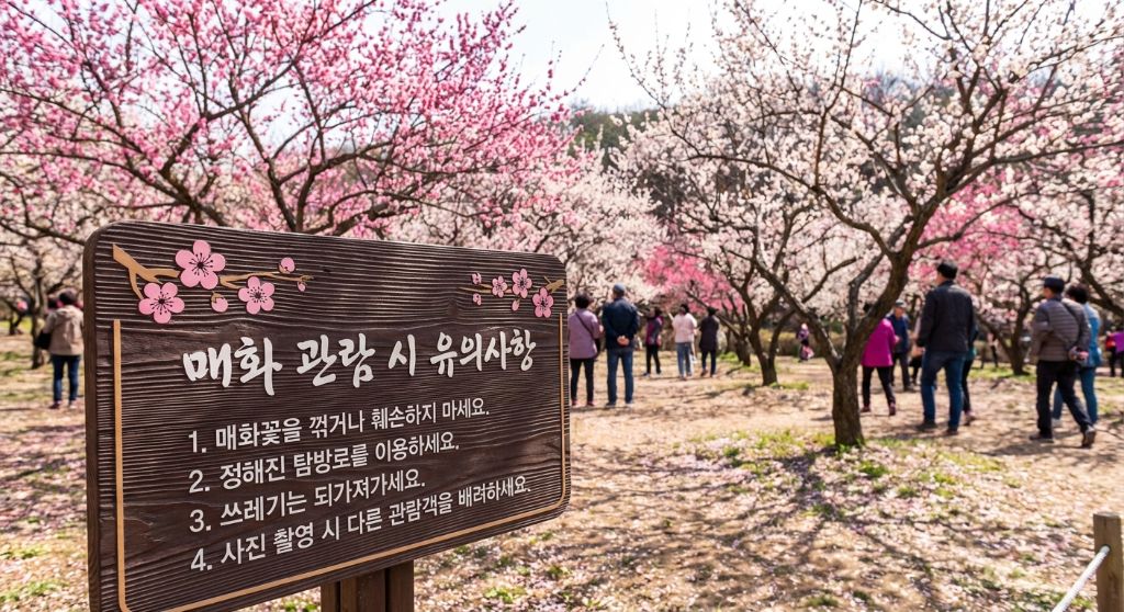 매화의 아름다움을 만끽하며 즐거운 시간을 보내기 위해서는 몇 가지 유의사항을 지켜주는 것이 좋습니다. 아름다운 자연을 보호하고 모두가 쾌적하게 관람하기 위함입니다.